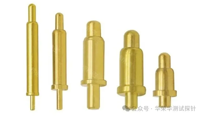 2. 头部设计: 平头接触面积大,压力均匀,接触电阻小于20mΩ,适合电池触点、无线充电底座,寿命通常能达到10万次以上,耐磨性好,多用于PCB刺破测试和精密探针,针尖直径通常不大于0.3mm,需要高硬度镀层。圆头是半球形,适配曲面接触,接触电阻在10到20mΩ之间,适合FPC软板连接、穿戴设备,曲率半径一般在0.2到0.5mm,能降低插拔应力。台阶头为多层阶梯形状,定位精准,接触电阻小于15mΩ,适合有高度差的连接和模组定位,使用时要匹配对接件的台阶尺寸。